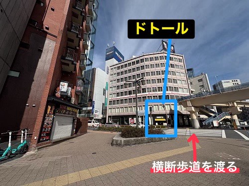 (横断歩道の先にDAISOや、つけ麺大山(ラに○のマーク)のビルが見えます)