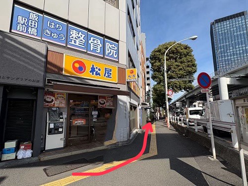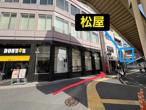 4. 渡ったら右に進み、松屋の先の道を曲がって、そのまま道なりに進みます。